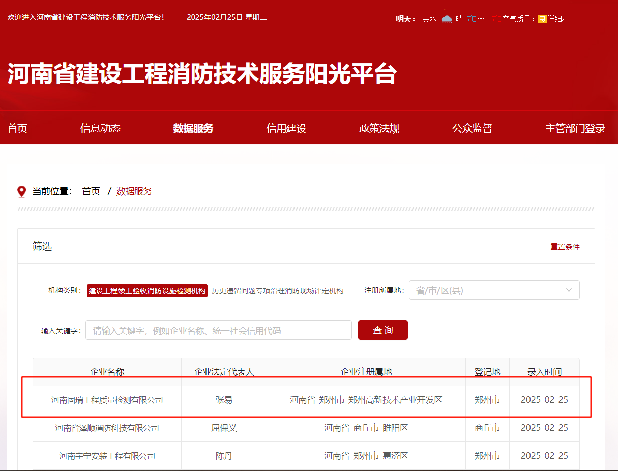 • 熱烈祝賀河南固瑞工程質(zhì)量檢測(cè)有限公司入冊(cè)河南省建設(shè)工程消防技術(shù)服務(wù)陽(yáng)光平臺(tái)!!!